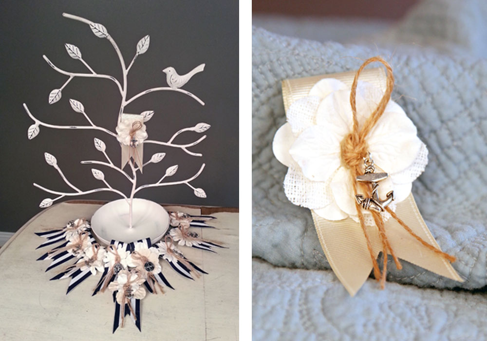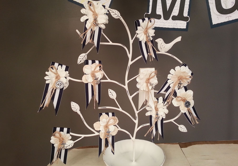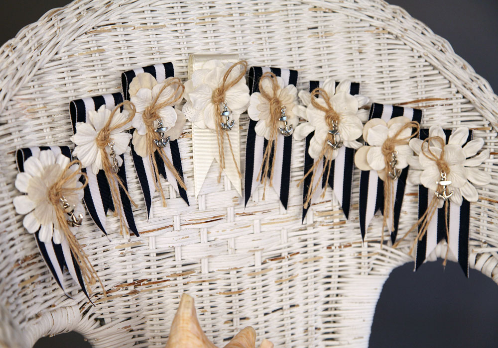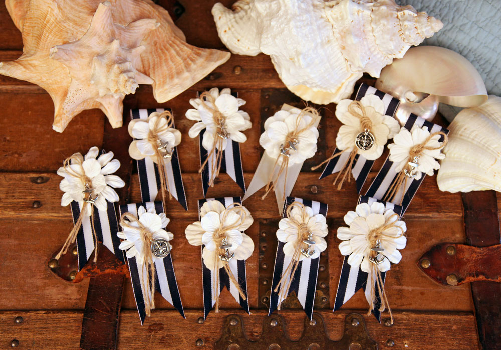 My talented mother made these kick butt boutineers for my brothers ocean side wedding.  The groom’s was all white, while all 7 of his groomsmen had navy and white stripped boutineers with an anchor in the center.  The anchor matched the anchor on the groom’s, while the fathers boutineers were decorated with a compass, as they have been the guides throughout their children’s lives.  Pretty cool stuff!  Good job mom, these are beautiful, creative and about as good as any boutineer I’ve ever seen!