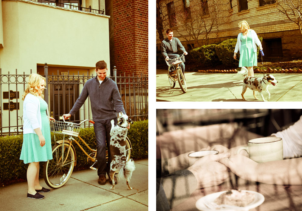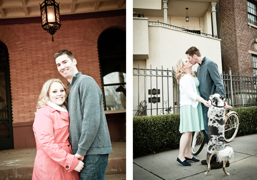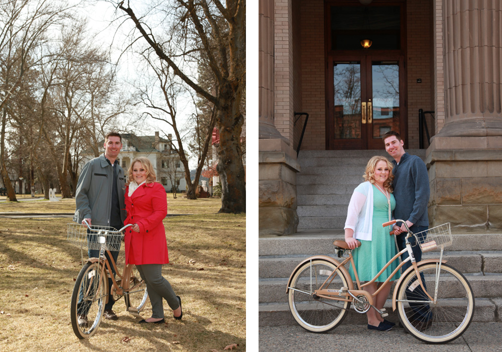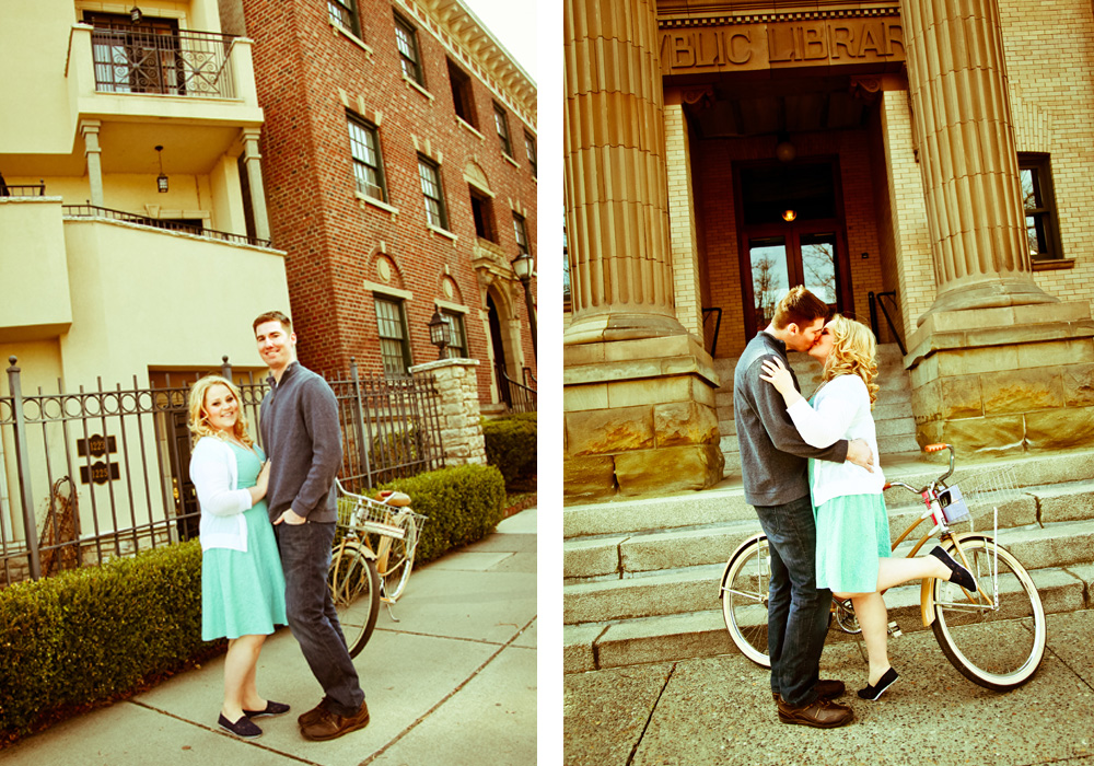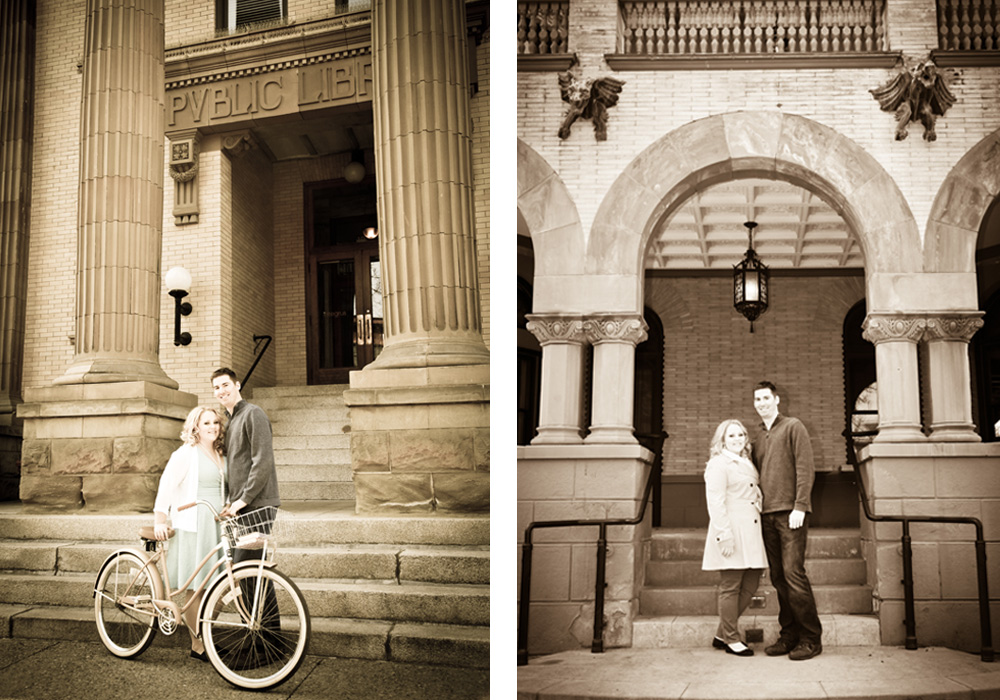 Where do I start with Jessi and Matt?! I’ve known Matt for 11 years, and I feel like I can say that I’ve never seen him happier! And I think the first time Jessi and I met was when I was shooting one of our mutual friends’ weddings. I just remember Jessi’s beautiful smile and thinking “Way to go Matt!” HaHa Even though I’ve only known Jessi for about 2 years, I feel like I can talk to her about anything, and that makes shooting their photos so easy! I know Matt and Jessi, I know their likes and dislikes, and I find myself laughing and agreeing with EVERY post Jessi puts on Facebook! We both have that school teacher/ book worm/ nerdy sense of humor. We even got the same actress when we did the questionnaire on buzzfeed.com, “What actress would play you in the movie version of your life?”! HaHa (It was Emma Watson f.y.i) Again, I don’t even know where to start when talking about their engagement session… The ring (it’s PINK, which has been my favorite color since I was little) Niko, their Australian Shepherd with one brown and one blue eye, the vintage bike… they had so many great things! Matt rides mountain bikes, and I mean pretty extreme stuff! So I thought we were going to hit up Beacon Hill or somewhere close where he rides, but instead Matt showed up with this vintage tan colored cruiser bike WITH A BASKET on the front! And I was like, “Um, Matt, what’s that? You don’t ride those kind of bikes!” And Matt told me they had just bought the bike the night before and thought it would be perfect for their engagement photos! Which of course it was! Everything just fell into place. We had finally gotten some great weather, we happened to find an old public library, and Jessi’s mom was able to tag along to be the dog wrangler! If the wedding day goes half as well as the engagement photos, it’ll be a HUGE success! Cheers to you two! I can’t believe Jessi had 156 “Likes” when she used an image from the engagement session as her profile picture! Things like that make me so happy and excited to be just a small part of their lives and one of the people they trust to help throw the best wedding ever! Thank you! xoxo, Emma
